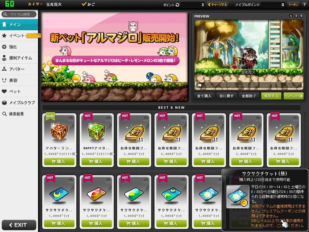 5日の露店を希望との事ですが、下手に送ると期限が非常にもったいない?ので配達日の指定をお願いします。特に返事がなければ10/10(木)の夜頃に送ります。メイポンは送っておきました~^^